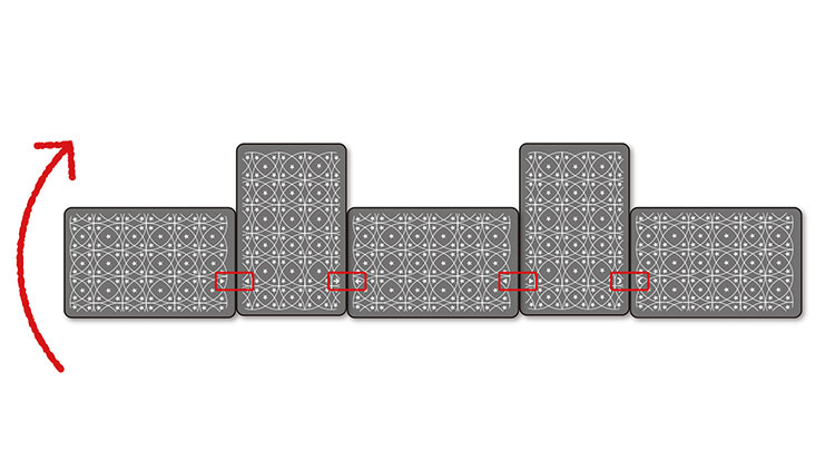 3In order to reproduce the order of the symbols, you need to arrange them horizontally, vertically, horizontally, vertically, and horizontally. Once you've lined them up and you flip the final card, make sure not to wreck the symbols you made. Flip them one at a time, not left to right, but up and down.