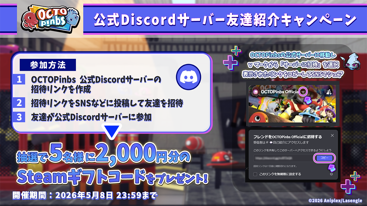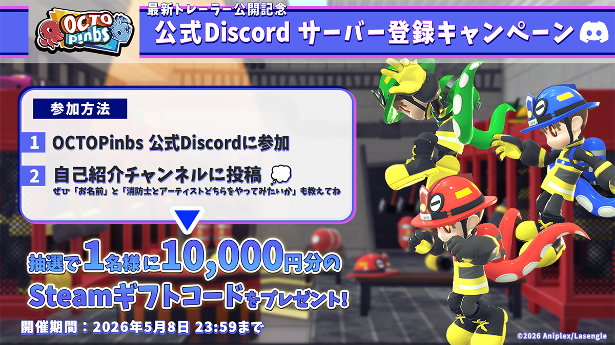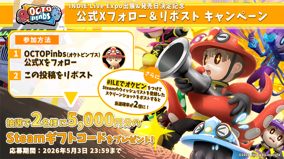 『OCTOPinbs』公式XとDiscordにて、抽選でSteamギフトコードが当たるプレゼントキャンペーンを3件実施いたします。
